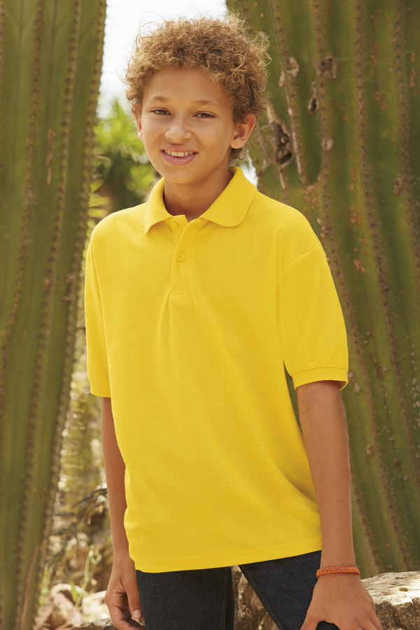 100% Cotone 170 gr/m2 bianco 180 gr/m2 colorato Collo in costina piatta Due bottoni in tinta Manica senza costina