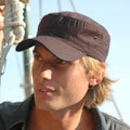Bordi consumati effetto used per il cappello in cotone chino lavato. Chiusura con cinturino in tessuto e fibbia slide. 100% COTONE LAVATO
